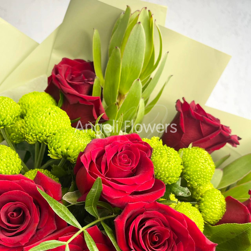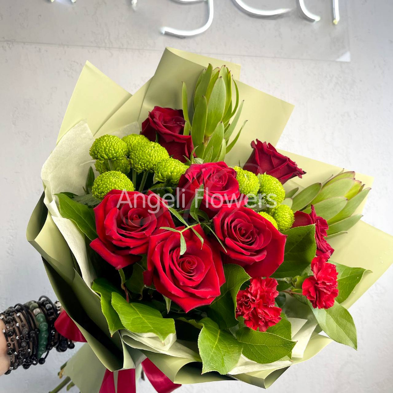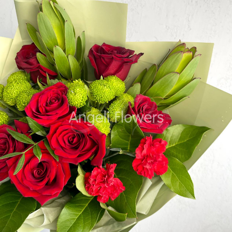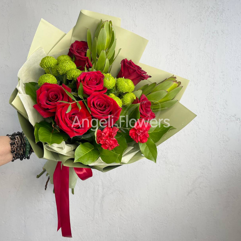 Букет из ярких красных роз, гвоздик и зелёных суккулентов, дополненный оригинальными зелёными бутонами, станет прекрасным подарком для любимых. Нежные и яркие цветы в элегантной упаковке обязательно произведут впечатление на получателя.