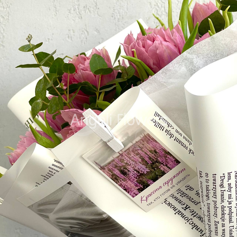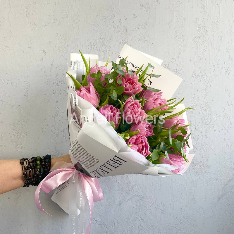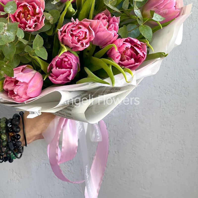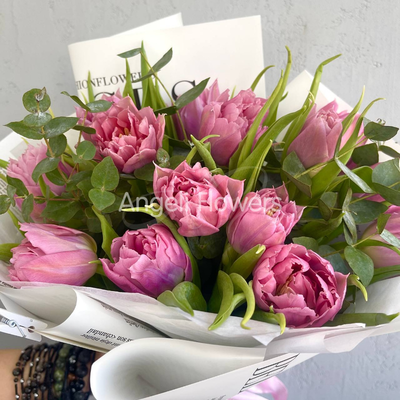 Букет состоит из розовых тюльпанов, дополненных свежей зеленью эвкалипта. Нежные, пышные цветы создают ощущение весеннего настроения и элегантности. Идеальный подарок для тех, кто ценит романтику и изящество