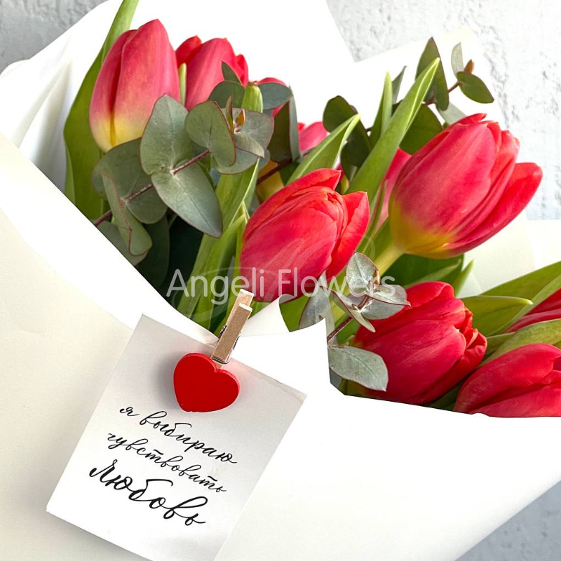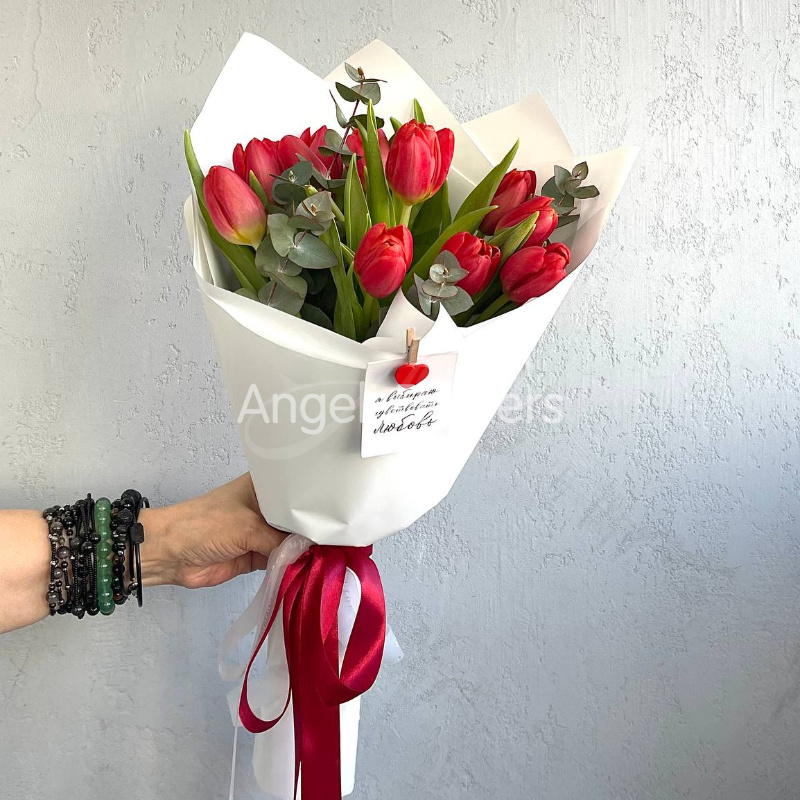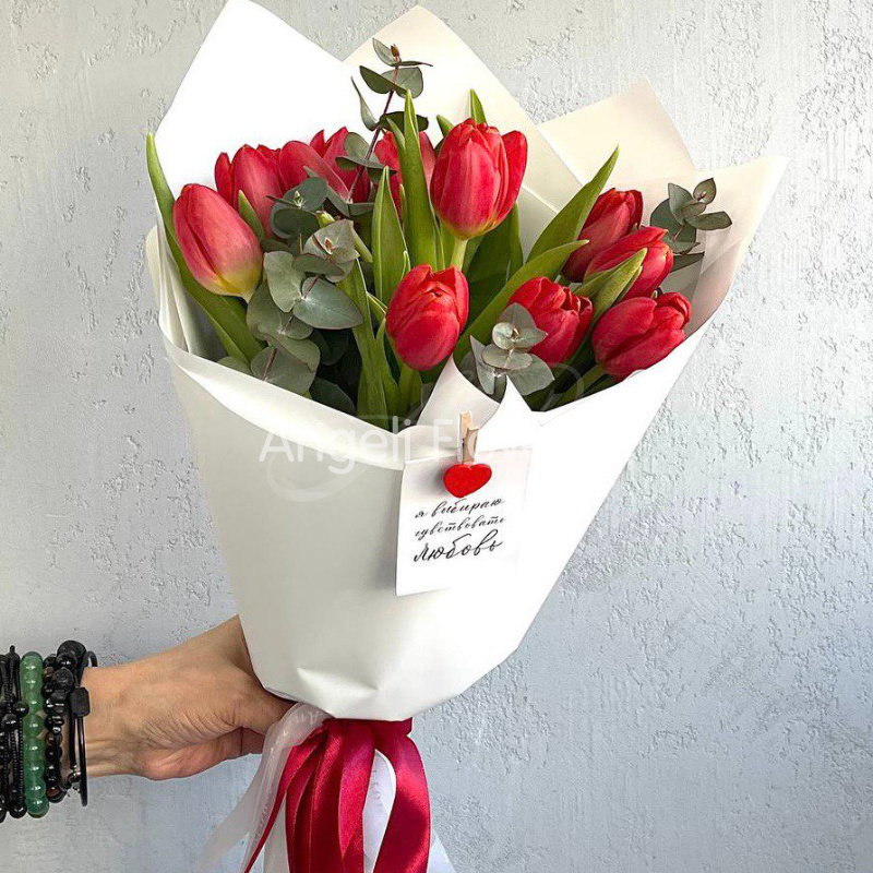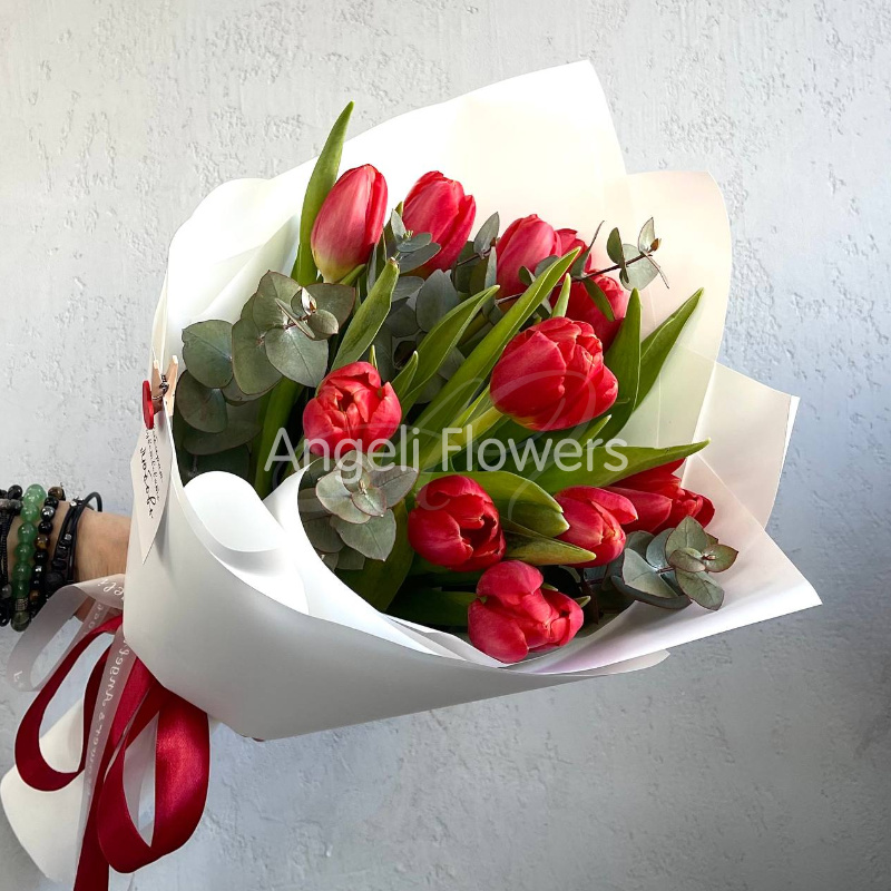 Букет из красных тюльпанов с добавлением эвкалипта, создающий атмосферу свежести и элегантности. Нежные лепестки цветов сочетаются с зеленью, образуя гармоничную композицию, идеальную для выражения любви и признательности.
