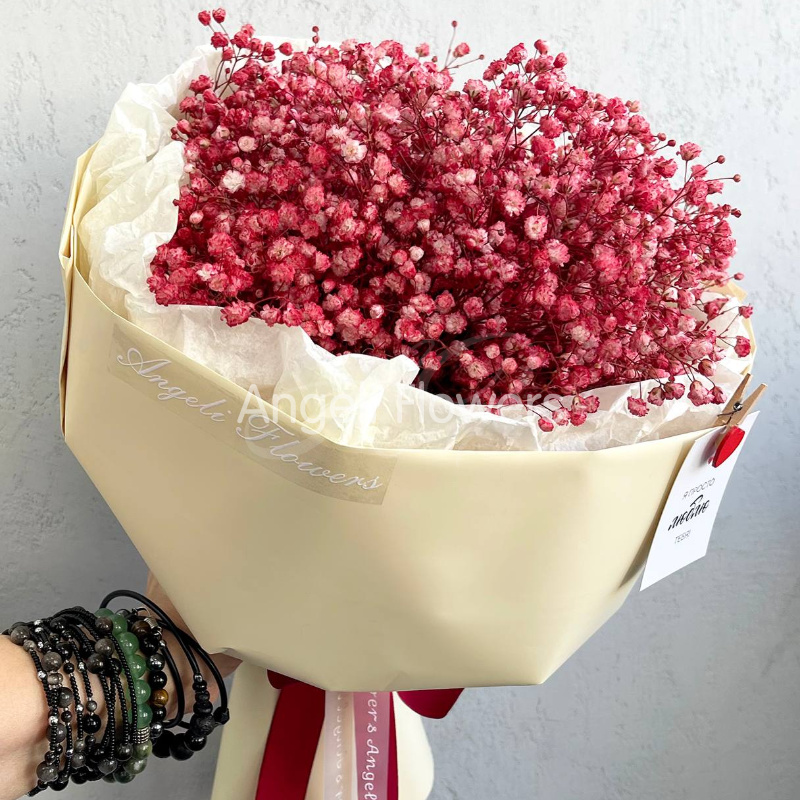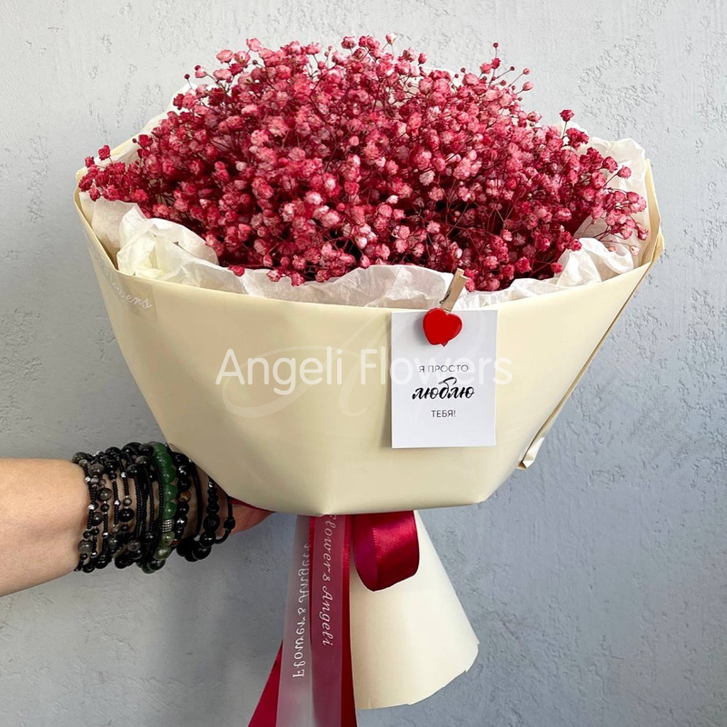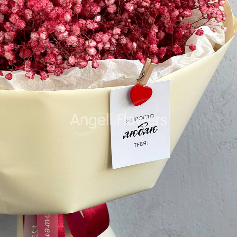 Нежный букет из воздушных гипсофил розового цвета, перевязанный атласной лентой и дополненный трогательной открыткой с сердечком. Этот букет станет прекрасным выражением любви и заботы.