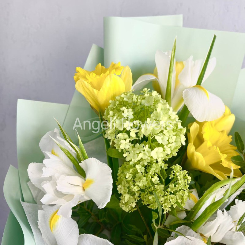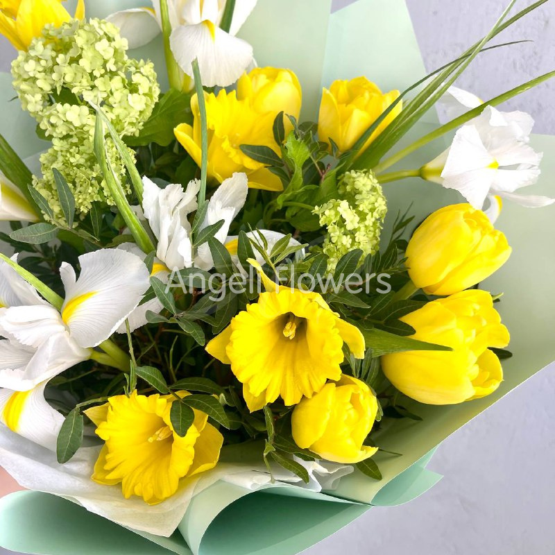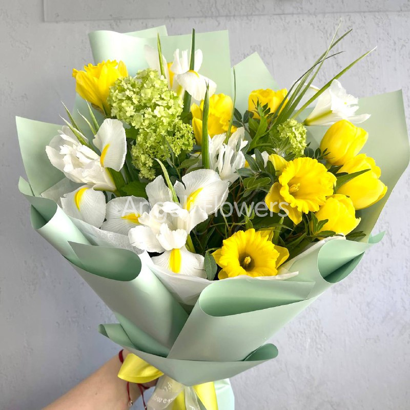 Букет «Солнце весны» насыщен яркими и свежими цветами, создавая ощущение солнечного пробуждения природы. В его составе находятся нежные нарциссы, символизирующие новые начинания и светлое будущее. Вибурнум добавляет легкую воздушность и аромат, напоминая о тёплых весенних днях. Тюльпаны в букетах ассоциируются с любовью и романтикой, придавая композиции изящества. Ирисы дарят глубину и загадочность, делая букет более многогранным. Фисташка придает свежесть и природную гармонию, завершая общую концепцию. Такой букет станет замечательным выражением радости и весеннего настроения.