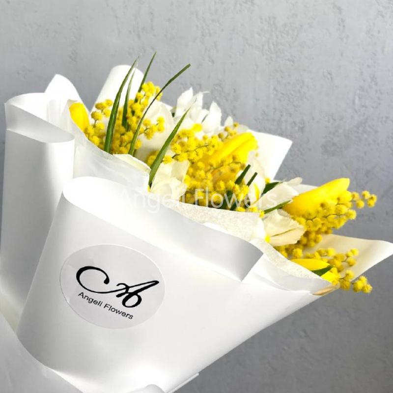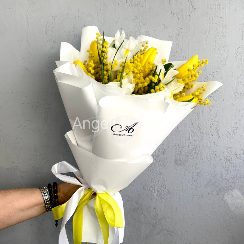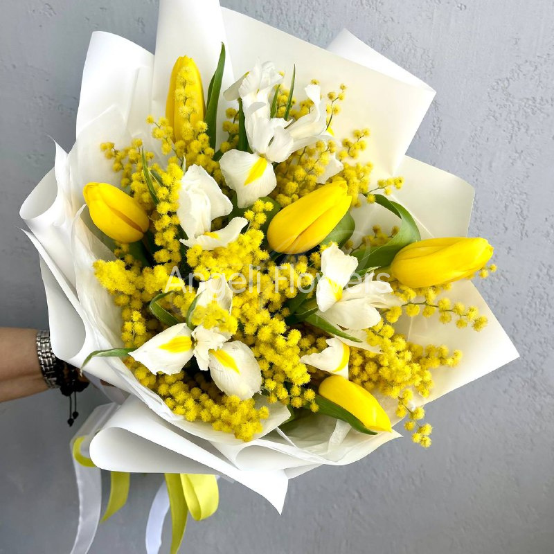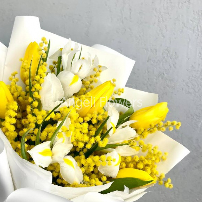 Букет, состоящий из ярких желтых тюльпанов, воздушных белых ирисов и нежной мимозы, создает ощущение солнечного весеннего дня. Сочетание цветов наполняет образ легкостью и радостью, идеально подходя для подарка близкому человеку. Этот букет станет прекрасным выражением любви и благодарности.